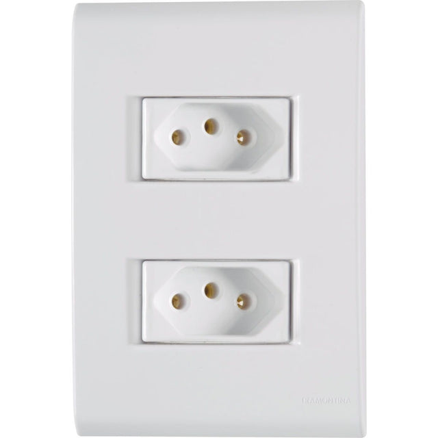 Este conjunto oferece duas tomadas em uma única peça, otimizando o espaço e a organização da sua instalação elétrica.